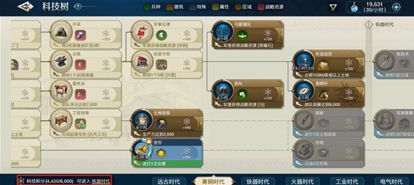 目前世界启元分为远古时代、青铜时代、铁器时代、火器时代、工业时代、电气时代,想进入下一时代需要满足一定的科技积分与城市生产力,每当点亮科技树上的一个科技,就会获得一定的积分,比如从青铜时代进入铁器时代,需要6000科技积分,而在青铜时代,点亮科技树上的“货币”科技,就会获得480积分,当我们点够6000积分、城市生产力达到4500,就能进入铁器时代了。至于城市生产力怎么增加,一方面扩张领土,另一方面就是点亮科技树上的各种增加生产力的科技了。