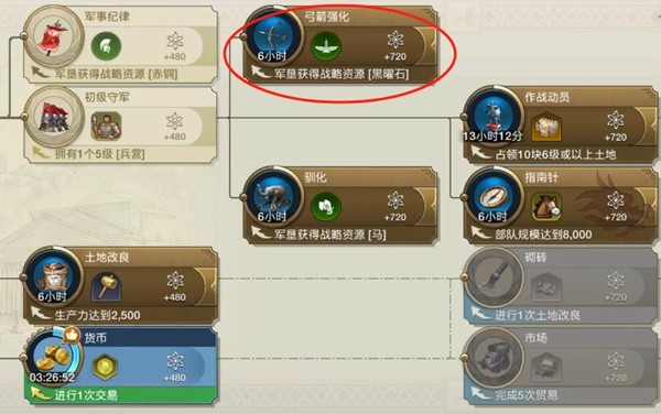 另外,有些分支末端是可以不点的,比如青铜时代的“弓箭强化”,作用是解锁“战车射手”兵种,但这个科技处于这个分支最末端,对后续科技几乎无影响,当你积分足够不需要这个科技时可以不点。