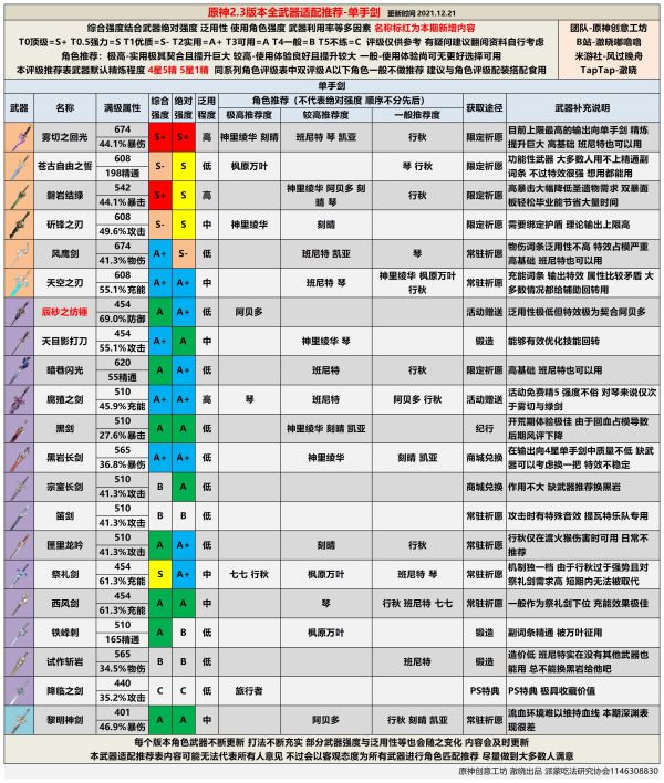2.新增4星武器辰砂之纺锤的评级推荐内容;