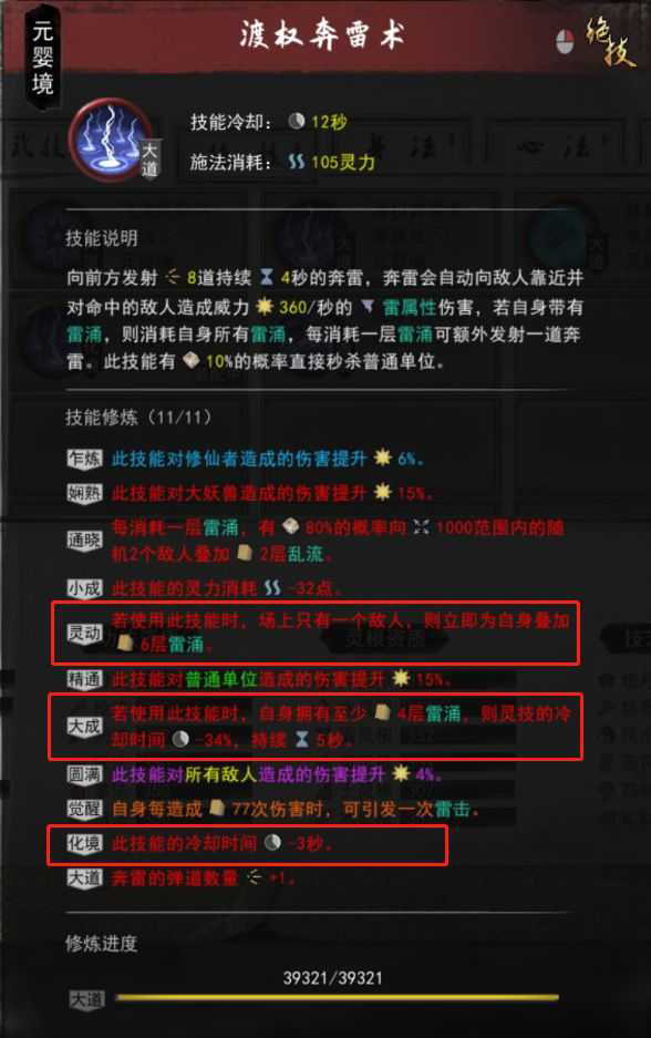 奔雷术词条在只有一个人的情况下产生6层雷涌,还有4层雷涌就能提高34%灵技冷却。自己产生雷涌自己用。