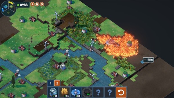 除了这种基础地块的转化,游戏中还存在“二次建造”以及“深度变化”,比如沼泽地需要建造在河边的灌溉机——这就提出了复合化的需求,也让玩家在最开始铺设灌溉机时,就需要更多的为后续的进一步改造做考虑,类似的还有蜂巢需要挂在松树上等等。而类似于草地这种已经改造完成的环境,还可以用太阳能设施放一把野火——野火会把没有山坡和河流隔断的绿化焚烧殆尽,但是也会留下养分丰富的草木灰,可以转化为二阶的绿化设施(游戏一共包含了三阶绿化设施,一阶是基础变化、二阶是进阶&复合变化、三阶是回收&动物相关)。