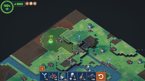 那么游戏的乐趣体现在哪呢?首先体现在最大化的利用各个设施的覆盖范围上——比如风电站覆盖一块矩形范围,那么以矩形的四个角出发,就可以扩展出一个大一圈的“净土”面积,然后可以调配灌溉机的角度来完成最高效的绿地覆盖。游戏中所有设施都可以完成类似于俄罗斯方块一样的朝向改变,来更有效率的完成绿化的覆盖。