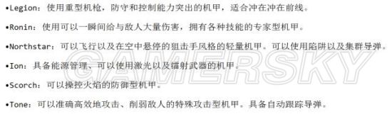 每种武器都有数种配件可供玩家选择,同理泰坦也一样,本作泰坦一共有6种,分别为: