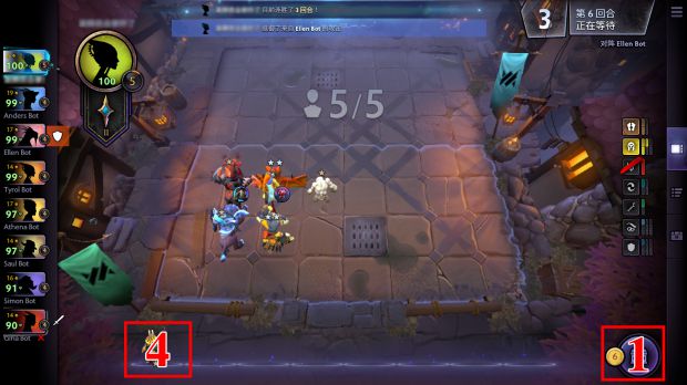2.棋子的上场:关掉棋盒界面(位置3,默认快捷键space),我们就会发现,购买的棋子在下面的等待区(位置4)。在准备阶段用鼠标拖动棋子放到作战区即可完成棋子的上场。