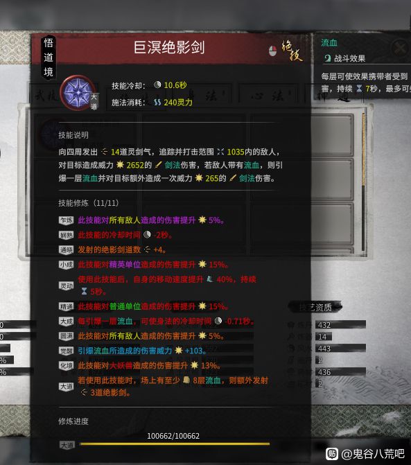 身法4个冷却,2个持续,全程无敌哈哈,5s的身法一个绝技引爆流血立马冷却,就是有点费蓝,现在的灵力心法还是化神境的。