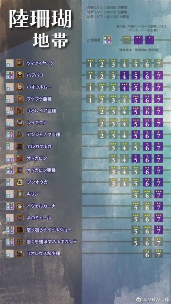 珊瑚&瘴气:蛮愕龙(R10攻,R11槽),历战毒妖鸟(R11吸),雌火龙(R11吸2),浮眠龙,斩龙(R11会),历战飞雷龙,火龙,黑狼鸟(R11会,R11吸),苍火龙,刚龙(R12攻)。历战土沙龙,角龙(R10攻2),黑角龙(R10槽,R12槽),炎王龙(R11槽),炎妃龙,金火龙(R10槽2)。