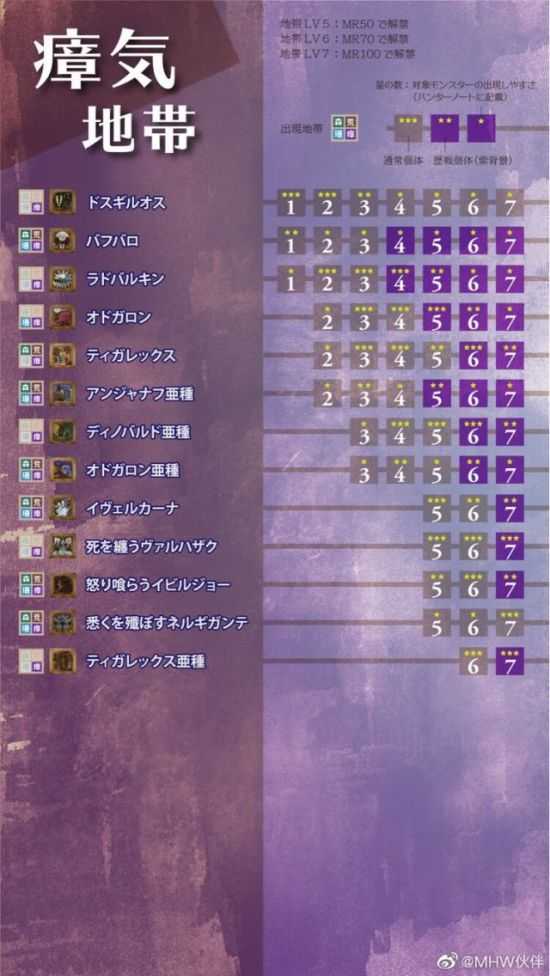 森林&瘴气:历战浮空龙,历战水妖鸟,风飘龙(R10属2),麒麟,冥波龙(R10属3,R12吸),银火龙。历战土沙龙,樱火龙,角龙(R10攻2),黑角龙(R10槽,R12槽),炎王龙(R11槽),炎妃龙,金火龙(R10槽2)。