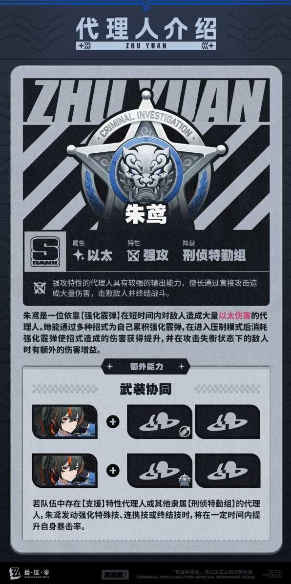 答:朱鸢是一位以太属性的「强攻」角色,能够通过强化特殊技、连携技和终结技积攒【强化霰弹】,霰弹在长按普攻进入【压制模式】后可进行消耗,以此输出大量集中的以太伤害,是一名高爆发的强攻角色。角色自身还具有很强的机动性,普攻第一段能拉近敌我距离,在近战和远程射击中切换自如。
