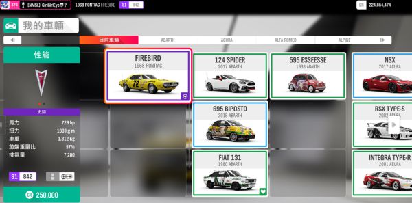 68年的火鸟在FM4之后就再也没有出现在任何一作极限竞速里,在FH4算是第一次回归,这台搭载6.6LV8引擎,输出335hp的Camaro同平台pony颜值是真的高,而且你给它加一个机增拉满动力可以顶到729hp,要知道Challenger R/T同样水平拉满也才730hp,所以这台400cui V8的潜力还是蛮不错的,而且车重也能减到1309kg,老肌肉里算是挺轻的。