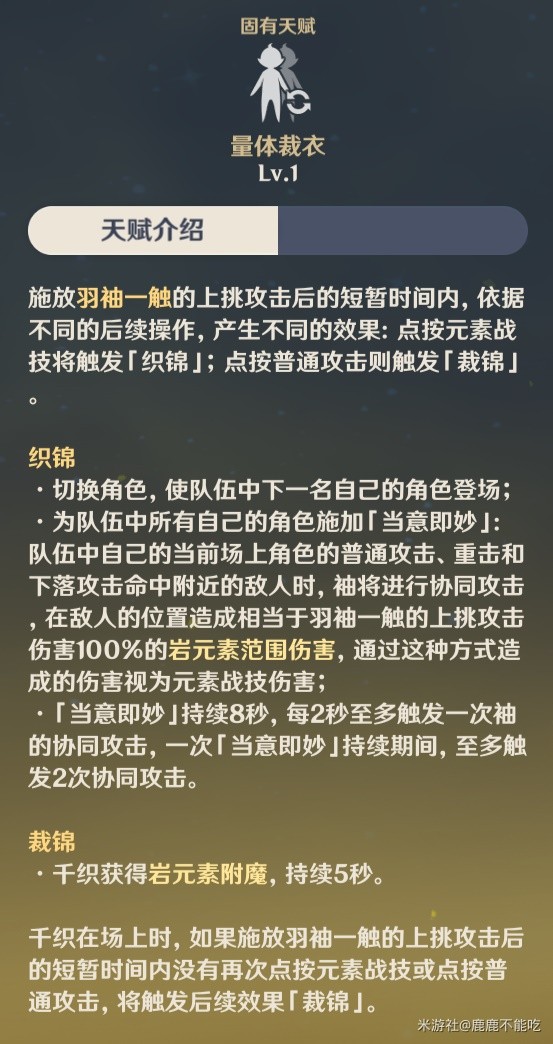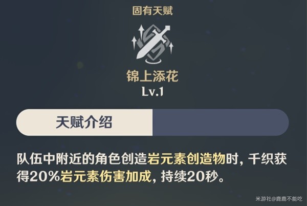 0命千织本身就需要队友的岩造物才能发挥战技的全部能力,因此天赋二的岩伤加成可以说是全程覆盖了。虽然20%的加成并不算多,但考虑其覆盖率还算可以接受。