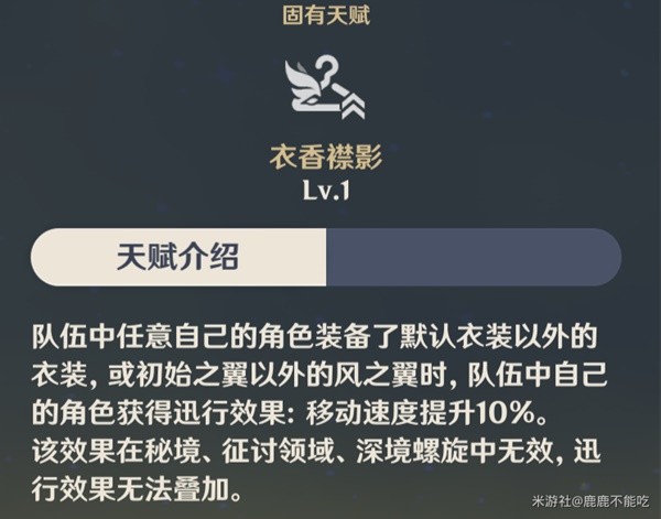 大世界探索时非常好用的天赋,衣装或许有门槛,但风之翼人人都能有,所以这就是常驻10%移速,相较于迪希雅、罗莎莉亚锁时间段的加速效果舒适了不少。