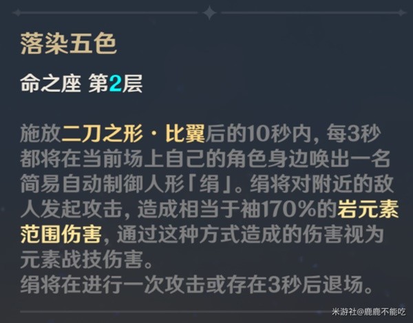 触发天赋后队友也能召唤与二命相同的人偶绢,最多召唤3名绢,总伤与袖5次攻击伤害的总和相近。