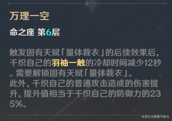 可以说,六命是一个改变千织玩法的命座,六命千织的定位已经由副c转变为主c,可以站场通过普攻和战技同时造成大量伤害。