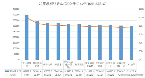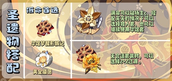 圣遗物在黄金剧团和华馆梦醒形骸记中二选一,0命千织主要定位是后台副c,其中元素战技伤害占比较高,黄金剧团是绝对契合的;华馆在吃满的情况下能提供24%岩伤和54%防御加成,同样十分契合。回声之林夜话由于buff只在战技施放10s后存在,而且需要结晶盾才能吃满buff,因此不推荐使用。