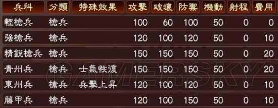 枪兵分为:轻枪兵、强枪兵、精锐枪兵、青州兵、东州兵、藤甲兵。