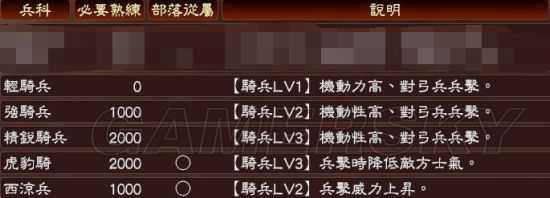 骑兵分为:轻骑兵、强骑兵、精锐骑兵、虎豹骑、西凉兵。