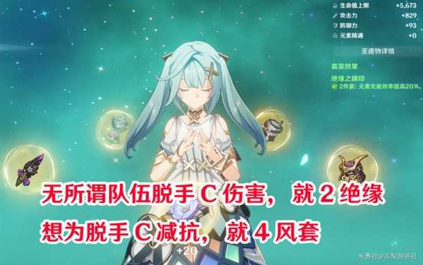 圣遗物就没太多讲究了,优先保证角色充能:一般是2绝缘+其他散件。若是队伍配合夜兰菲谢尔之类的“水火冰雷”高伤脱手副C,可考虑为珐露珊准备4风套减抗用。