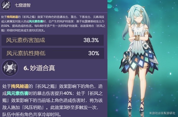 最高练度的情况下:13级大招38.3%风伤+降低30%风抗;天赋提供0.8秒一次的32%珐露珊基础攻击伤害转化;6命40%风系暴伤+3秒一次的自动聚怪。