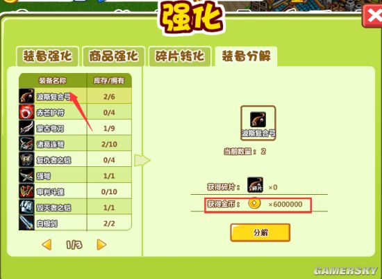 5、不需要的装备可进行分解,分解后装备数量减少,并获得相应的金币。