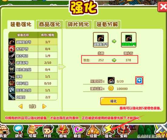 c) 只有有库存的装备才能进行强化(注意,在任意阵容中,装备中的装备不会显示在库存中)