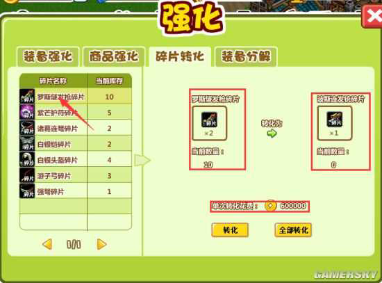 4、碎片转化可将不需要的碎片转化成指定的碎片,提高碎片的利用率;