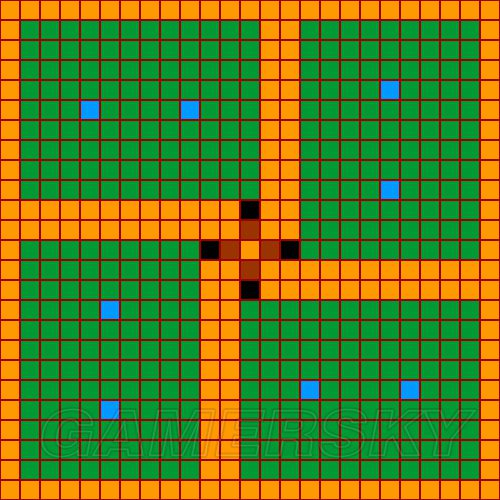 第三步:如下图,将会种地的四个村民分隔在下面的四块田中,每块田的大小为12X9。田与田之间用两个方块隔开。