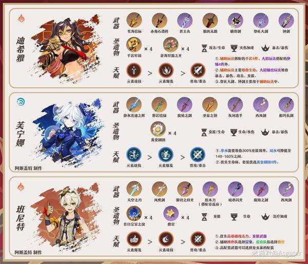 ① 因主打重击且存在多种元素伤害,可选用的通用水辅助不多,通常优选芙宁娜。