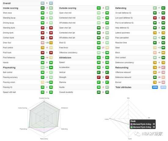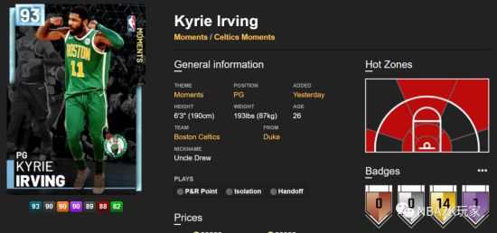 相比于早前出的欧文钻卡而言,这张卡虽然高了88点总属性,但基本都高在了篮板能力上,其余方面这张卡的三分和罚球能力稍高,老卡的抢断和传球视野更好一些。
