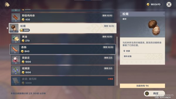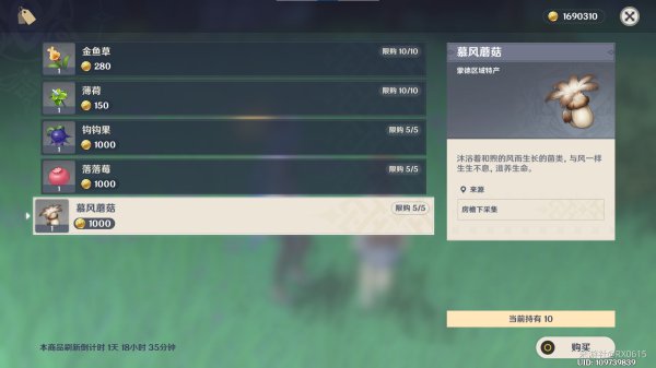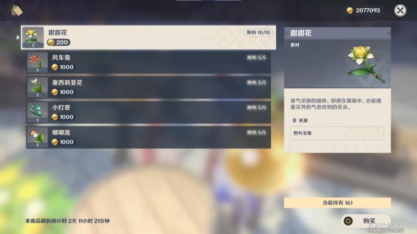 风车菊、塞西莉亚花、小灯草、嘟嘟莲(风车菊:主角、砂糖突破材料;塞西莉亚花:温迪突破材料;小灯草:皇女、安伯突破材料;嘟嘟莲:凯亚突破材料)每日刷新(必须在游戏中的白天购买)