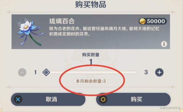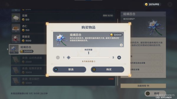 霓裳花、琉璃百合(行秋、凝光突破材料)霓裳花每日刷新,琉璃百合每月刷新(比起购买,琉璃百合还是更推荐去下面梯田里和玉京台采集)