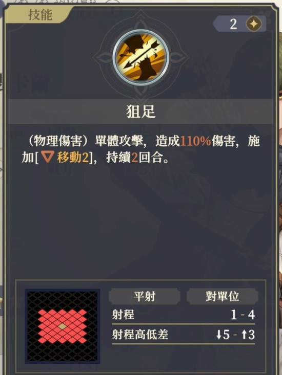 法卡尔自带技能为狙足,能够造成110%伤害,并施加一个降低移动的减益效果。狙足能够有效降低敌方的移动距离,配合自己的远射,法卡尔可以对大部分小怪进行放风筝。