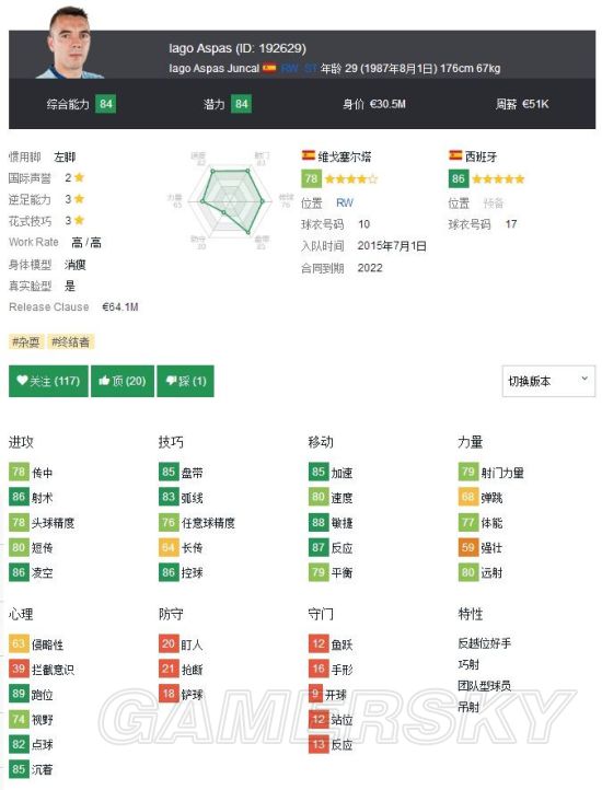 30岁的塞尔塔前锋阿斯帕斯在本赛季继续延续了自己的好状态,目前他已经打入21球,并有5次助攻入账。与莫拉塔相比阿斯帕斯的身高明显不占优势,但由此带来的移动属性的提升也是显而易见。