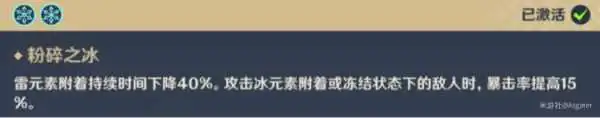 PS:①.套装选择上,冰套4件适用于暴伤、攻击词条武器,2+2搭配适用于副词条为暴击率的武器,除此之外也可以选择绝缘之旗印4件、冰套2+宗室2以体验主大招的玩法