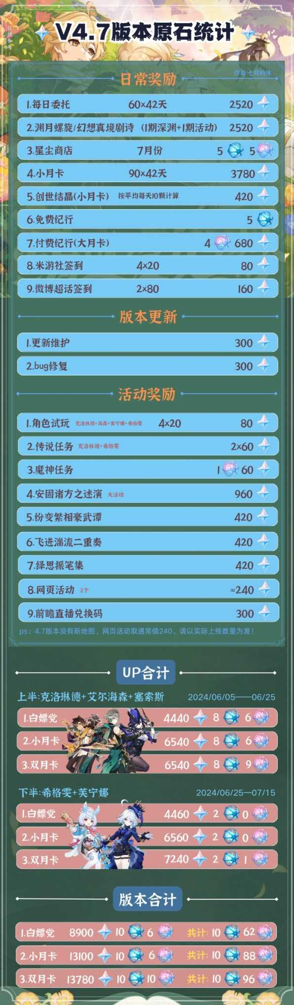 《原神》4.7版本即将更新,很多玩家想要知道新版本中有多少原石可以获取,下面请看“七月的休”带来的《原神》4.7版本原石数量汇总,希望能够用帮助大家。