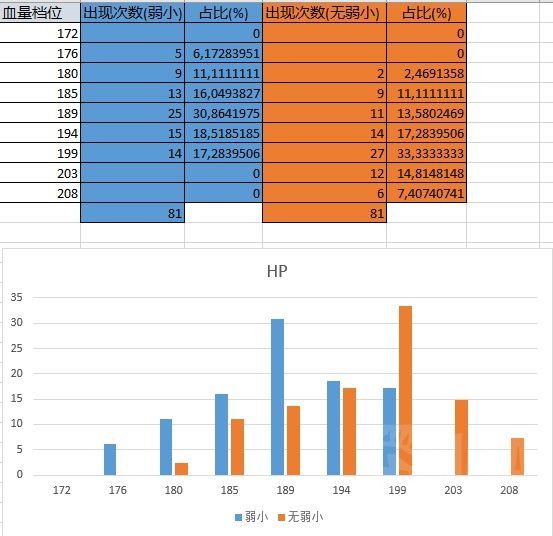 把两组记录的数据对比,发现弱小招来还是有意义的,至少203, 208这两档不会再出现,另外出现次数最多的血量从199降到189,其他档位也依次下降,粗略的算,就是有弱小招来,你可以少打1000hp左右。