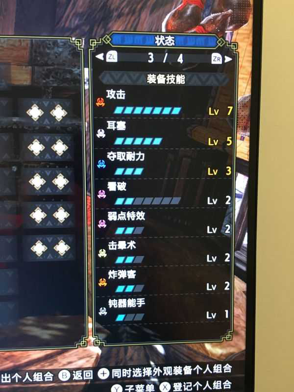 这套在没有武器孔和护石孔的情况下可以达到 攻击6耳塞5见切2击晕术2 不关键的一级孔有五个,请大家自行分配