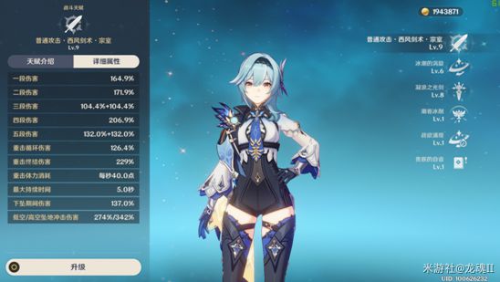 普攻为优菈的主要输出手段,为5段共7下的斩击,推荐优先点高,其总倍率已经经过了加强,从原先测试服10级的973%,变成了1093.3%,是目前大剑角色里普攻总倍率最高的角色,但是因为是连续5段的攻击,动作时间较长,仍略低于卢姥爷EAAA三连普攻取消后摇的DPA,这部分内容的详细数据在后面的DPA分析中会说到。