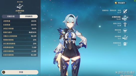 E技能是优菈的主要buff技能,通过冷酷之心的效果加上超导和钟离的盾,即使是独眼小宝也能削成负抗性。E技能的长按也是叠大招层数时很重要的技能,其技能面板还过得去,DPA计算出来也很高,但是因为是冰属性的关系,除了天赋1额外造成的残缺之剑以外,造成的总伤害并不算高,而且残缺之剑的伤害是由大招决定的,因此推荐最后升这个技能。