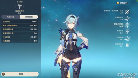 大招进行一次冰属性挥砍,而后生成一柄光剑,在大招动画结束后7秒左右爆破,优菈的每次攻击都可以给这把剑叠能量,增加最后爆破的伤害,0命一般可以叠13~15层,6命优菈才可以叠满层数。整个技能的伤害也比测试服时经过了加强,在本身普攻技能DPA不高的情况下,大招在一套连招中会占到优菈伤害的很大一部分,优菈10级大招的伤害按0命常规13层计算,达到了3094.2%的倍率,其中冰属性倍率442%,按一套连招EQEAAAAAE计算,连招总倍率为5864.3%,占比为53%,其中有冰属性倍率为1758%。因此大招为第二重要升的技能,同时因为大招的能量需求比较高,应该在配队上优先保证大招的充能效率。