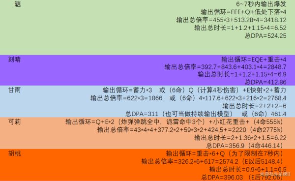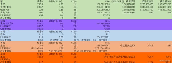 同样的计算了优菈本身的DPA倍率(因为大招的关系,时长只能超时了),然后和以前测过的主C全部放一起对比。