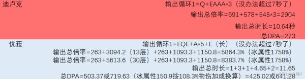 由于优菈的部分伤害是异属性的冰属性伤害,所以没办法在处理的时候只能进行转换,是按常规物伤杯+苍白4件或染血2+苍白2的108.3物伤进行转换的。可以看到优菈的普攻倍率虽然较高,但是4.65s的输出时间较长,远大于卢姥爷的2.5s,因此DPA倍率235.1%略低于卢姥爷的256.5%,所以优菈如果只打普攻持续输出是比较弱的。大招的DPA界定其实有一点复杂,因为是延续性技能,所以DPA既可以按抬手的3秒计算,也可以按总时长的10秒计算,但是由于不打完10秒就不能造成伤害,因此这里选用的10秒作为参考标准。由于大招爆发很高,因此在整套技能爆发输出完成后,其总DPA倍率和总技能倍率仍然比卢姥爷0命甘雨这样的持续输出角色略高一些,此时的DPA更接近于刻晴和可莉这样的短爆发角色。而比起胡桃和魈这样的强爆发角色则要低一些。