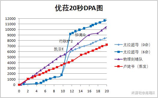 参照上面给出的输出模式,同样绘制了优菈的DPA输出曲线,同样以最平滑上升的卢姥爷的输出曲线作为参照,其中由于优菈和刻晴的伤害分为两个部分,因此对于优菈冰属性的伤害参照苍白4件的108.3%物伤加成进行了剔除,刻晴雷伤按风鹰剑苍白150.1%进行了剔除,只考虑技能倍率,自身减抗和命之座buff效果和人物属性差异暂时未考虑,其他队伍后台伤害不计算在内,由此绘制图形如下: