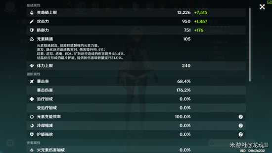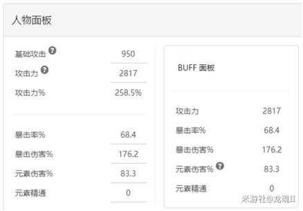 此时若是1命优菈,再提升30%物伤的情况下,物伤加成为138.3%,攻击力加成为140.5%,大致相等,如下图所示,此时攻击力即可达到最佳匹配值。因此在给尤拉选择武器和圣遗物的时候注意将攻击力加成与物伤加成尽可能调平即可,但是实际上如果不是圣遗物攻击力副属性歪的特别多的情况下,每把武器差距都不是很大。