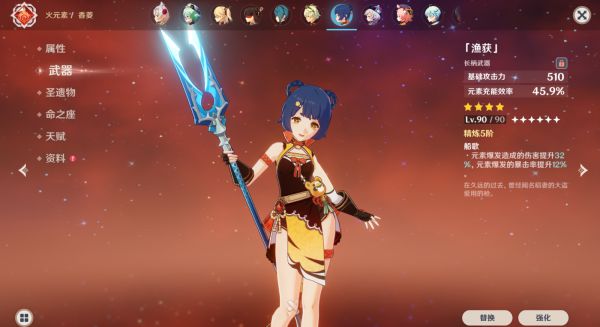 武器推荐大家带鱼叉,获取难度小,与香菱脱手大招的机制较为契合,同时鱼叉的充能属性可以保证香菱大招的能量积攒。当然如果有多的五星武器肯定优先啦。
