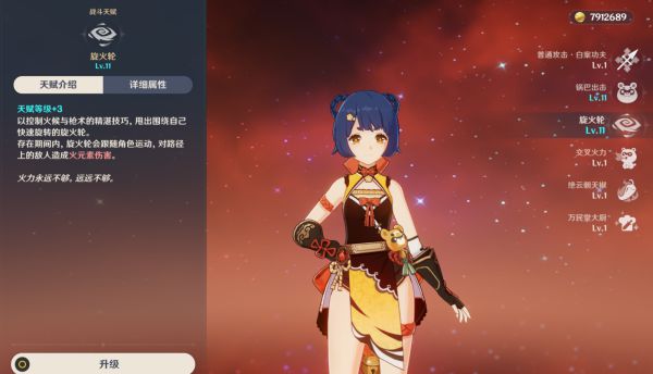 普通攻击-白案功夫:我个人在使用香菱时站场机会比较少,主要用来挂火与补伤,所以普通攻击并没有升级。