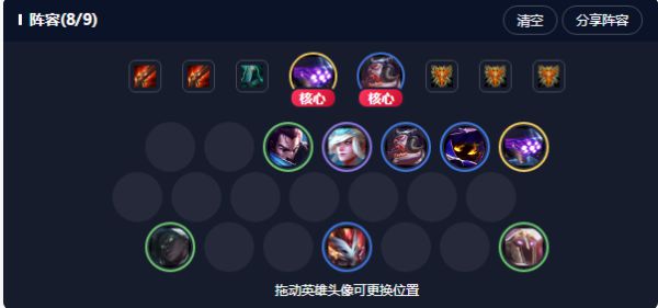 这是基本站位图,塞恩利用鸟盾和队友顶前面吃伤害,剑圣要是有2个火炮可以换到千珏的位置输出。