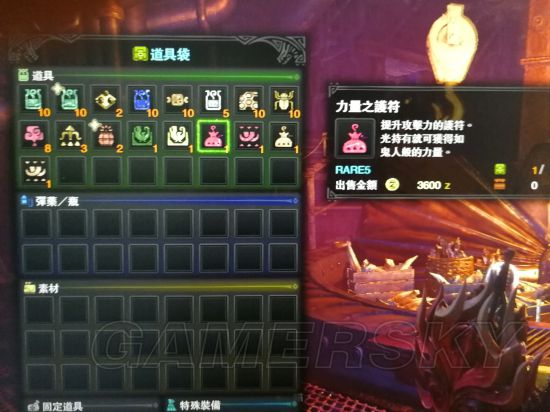 6.护符,商店里买的攻击护符,放在包里是加攻击的,可以和爆麟龙爪合成更高级的,而且叠加,也就是说,包里放4个,两个攻击,两个防御