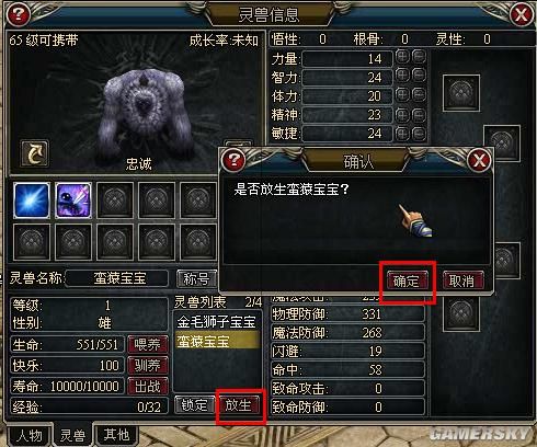 在打开的灵兽界面中选择想要放生的灵兽,放生,在弹出的确认框中选择确定,就可以将您的灵兽放生。