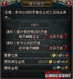 玩家需要准备一只携带等级大于或等于准备提升悟性灵兽的成年灵兽做为材料,选择好准备提升悟性的灵兽和做为材料的成年灵兽,提升悟性栏中会出现成功几率,确定进行悟性的提升操作。