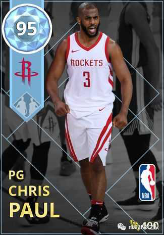 CP3在火箭终于摸到了西决地板,并且在与勇士队的比赛中发挥出色,再次证明了他就是如今NBA的“控卫之神”。这张钻卡在能力上与之前那张黄蜂保罗并无太大差距,他在投篮(中投97+三分96)、防守(抢断98、横移98)、速度(三速97)、组织(控球96、传球98)等方面都有着极高的数值,但不能扣篮和身高(1米82)则永远是保罗的硬伤,希望2K能在19中降低身高的影响。
